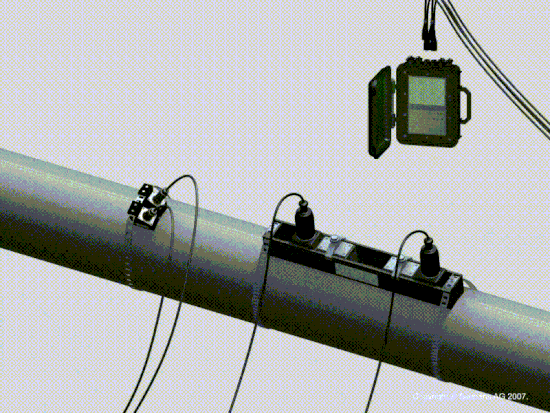 Los medidores de flujo ultrasónico no intrusivo (clamp on) utilizan dos sensores, uno instalado aguas arriba y otro aguas abajo del punto de medición tomado como referencia. Cada transductor envía una onda de sonido al otro y la diferencia de tiempo entre la recepción de las dos señales, indica la velocidad del fluido, que es proporcional a la rata de flujo.