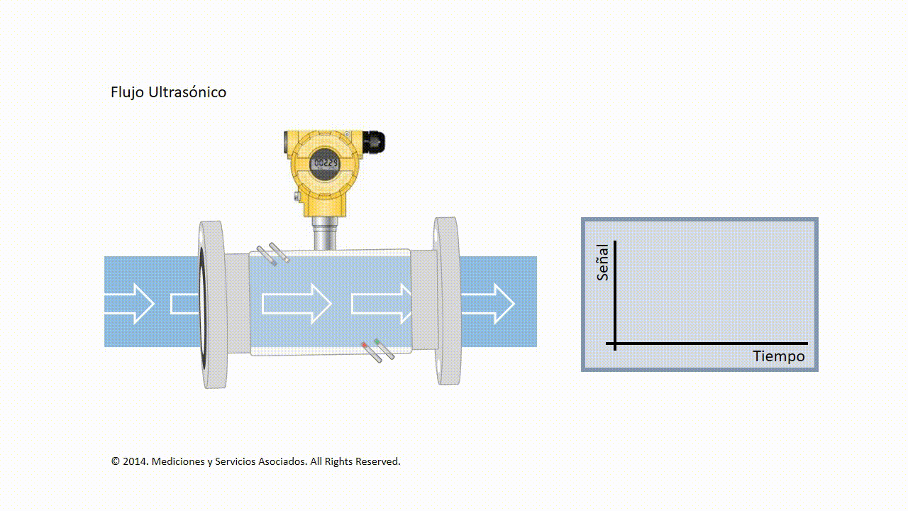 Los medidores de flujo ultrasónico pueden medir todo tipo de fluidos conductivos o no conductivos empleando ondas de sonido que se transfieren al interior del medio para determinar la rata de flujo. Los pulsos generados por el transductor viajan a la velocidad del sonido a través de un fluido en movimiento, la velocidad de propagación del sonido en el medio, depende del fluido que esta siendo medido y de la temperatura del producto. Debes tener en cuenta que fluidos muy viscosos no es posible medirlos, el máximo rango de viscosidad es de 350 cSt.
