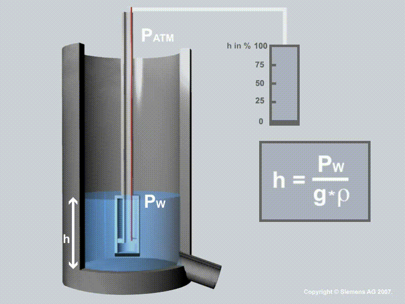 Los medidores de nivel por presión hidrostática se basan en el principio que la presión medida en el fondo del tanque es proporcional a la altura del liquido. El transmisor puede ser sumergible o estar conectado directamente a la parte inferior del tanque, en este tipo de medición, no tiene influencia el diámetro del tanque y lo podemos corroborar con la expresión que determina la presión que es: